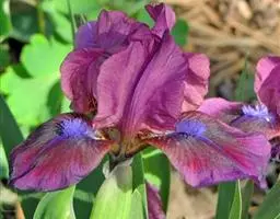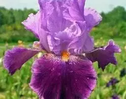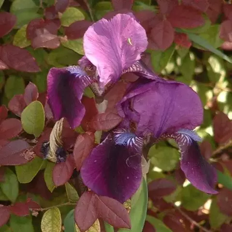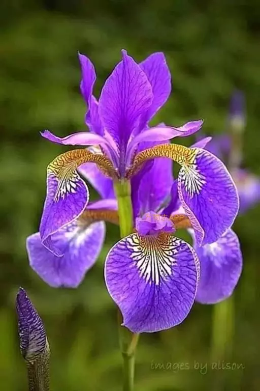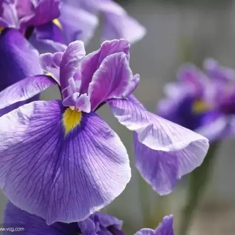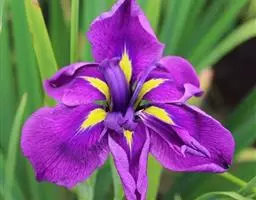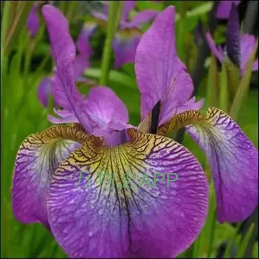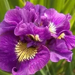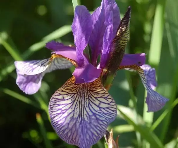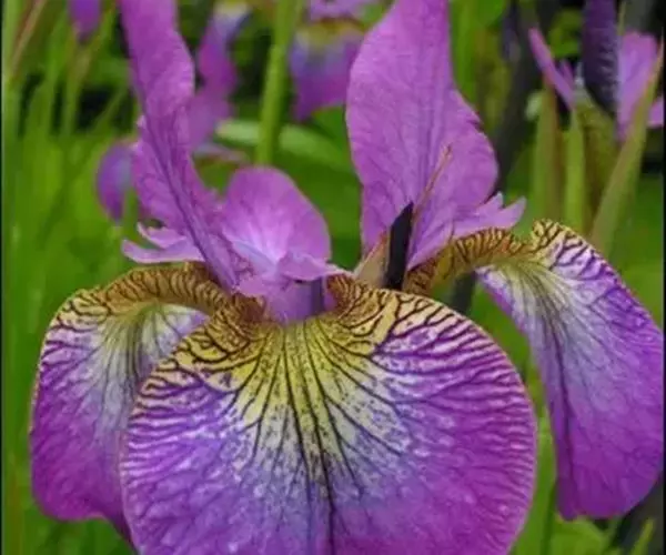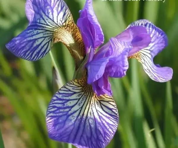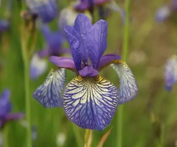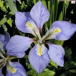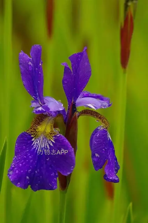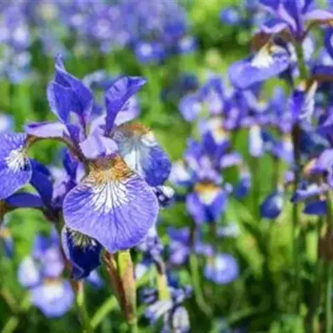 西伯利亚鸢尾(学名:Iris sibirica L.):多年生草本植物,植株基部围有鞘状叶及老叶残留的纤维。根状茎粗壮,斜伸;须根黄白色,绳索状,有皱缩的横纹。叶灰绿色,条形,顶端渐尖。花茎高于叶片,平滑,高40-60厘米,有1-2枚茎生叶;苞片3枚,膜质,绿色,边缘略带红紫色,狭卵形或披针形,顶端短渐尖,内包含有2朵花。花蓝紫色;外花被裂片倒卵形,上部反折下垂,内花被裂片狭椭圆形或倒披针形,直立。蒴果卵状圆柱形、长圆柱形或椭圆状柱形,无喙。花期4-5月,果期6-7月。