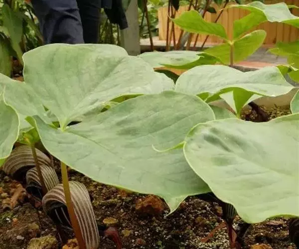 象头花又名:象鼻花、三步莲。块茎扁球形,直径1-6厘米或更大,颈部生多数圆柱状肉质根,周围有多数直径1-2厘米的小球茎,均肉红色(故有红半夏、红南星之称),小球茎逐渐与母体分离,然后萌发为独立的植株。鳞叶2-3,披针形,膜质,最内的长13-20厘米,淡褐色,带紫色斑润,包围叶柄及花序柄,上部分离。叶1,叶柄长20-50厘米,肉红色,基部粗可达1-2厘米,下部1/4-1/5鞘状。幼株叶片轮廓心状箭形,全缘,腰部稍狭缩,两侧基部近圆形。成年植株叶片绿色,背淡,近革质,3全裂,裂片无柄或近无柄,中裂片卵形,宽椭圆形或近倒卵形,基部短楔形至近截形,骤狭渐尖,长7-23厘米,宽6-22厘米;侧裂片偏斜,椭圆形,外侧宽几为内侧的2倍,比中裂片小,基部楔形,长6-20厘米,宽5-19厘米,均全缘,侧脉5-10对,集合脉距边缘3-6毫米,有明显的网脉。花序柄短于叶柄,长10-0厘米,粗3-6毫米,肉红色,花期直立,果期下弯180度。佛焰苞污紫色、深紫色,具白色或绿白色宽条纹(宽1.5毫米),管部长4-6厘米,圆筒形,粗1.2-2厘米,喉部边缘反卷约1毫米;檐部下弯成盔状,长4.5-11厘米,渐尖,有长1-2厘米或5-6厘米以上的线形尾尖,下垂。肉穗花序单性,雄花序紫色,长圆锥形,长1.5-4厘米,粗2.5-6毫米,花疏,雄花具粗短的柄,花药2-5,药室球形,顶孔开裂,附属器绿紫色,伸长的圆锥状,长3.5-6厘米,基部粗4-8毫米,向下渐狭成短柄,上部粗约1毫米,由中部以下开始下弯,有时几弯成圆圈,稀近直立。雌花序圆柱形,长1.2-3.8厘米,粗0.8-2厘米,花密,子房绿紫色,顶部扁平,近五角形,下部棱状楔形,长5毫米,柱头明显凸起,胚珠2,近纺锤形,白色,珠柄短,直立。浆果绿色,干时黄褐色,倒圆锥形,长达1.2厘米,粗5毫米,种子1-2,倒卵形或卵形,种皮淡褐色,骨质,表面泡沫状。花期5-7月,果9-10月成熟。
