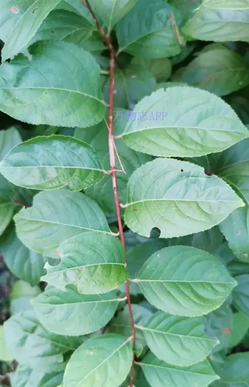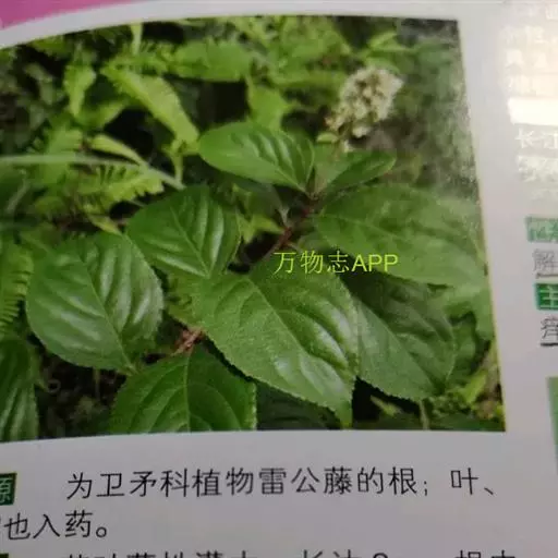 雷公藤 藤本灌木,高1-3米,小枝棕红色,具有4-6根细棱,被密毛及细密皮孔。叶椭圆形、倒卵椭圆形、长方椭圆形或卵形,长4-7.5厘米,宽3-4厘米,先端急尖或短渐尖,基部阔楔形或圆形,边缘有细锯齿,侧脉4-7对,达叶缘后稍上弯;叶柄长5-8毫米,密被锈色毛。