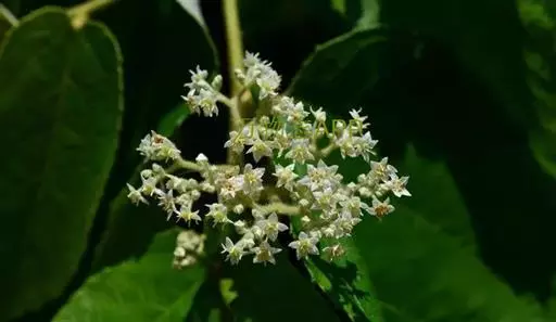 圆锥聚伞花序较窄小,长5-7厘米,宽3-4厘米,通常有3-5分枝,花序、分枝及小花梗均被锈色毛,花序梗长1-2厘米,小花梗细长达4毫米;花白色,直径4-5毫米;萼片先端急尖;花瓣长方卵形,边缘微蚀;花盘略5裂;雄蕊插生花盘外缘,花丝长达3毫米;子房具3棱,花柱柱状,柱头稍膨大,3裂。