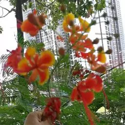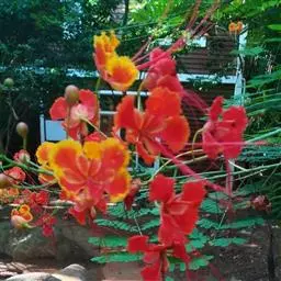 洋金凤 Sw.),豆科小凤花属灌木状或小乔木植物,枝无毛,绿或粉绿色;二回羽状复叶;总状花序伞房状,…