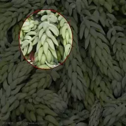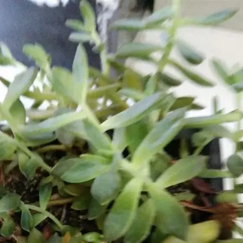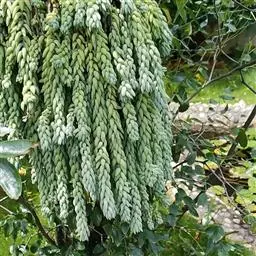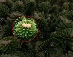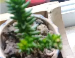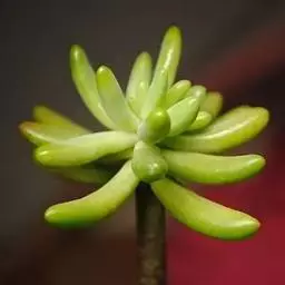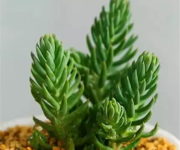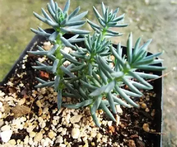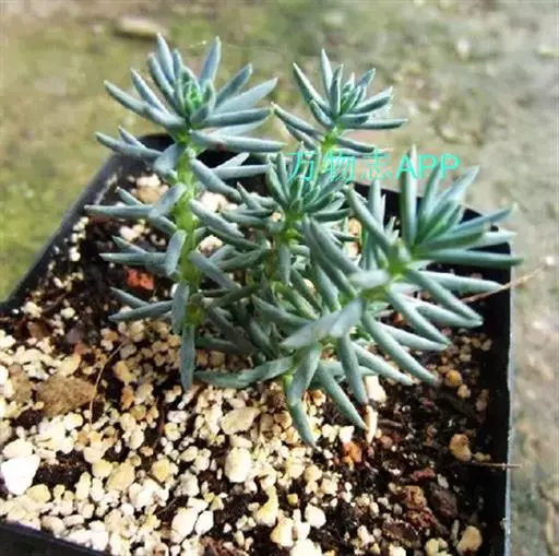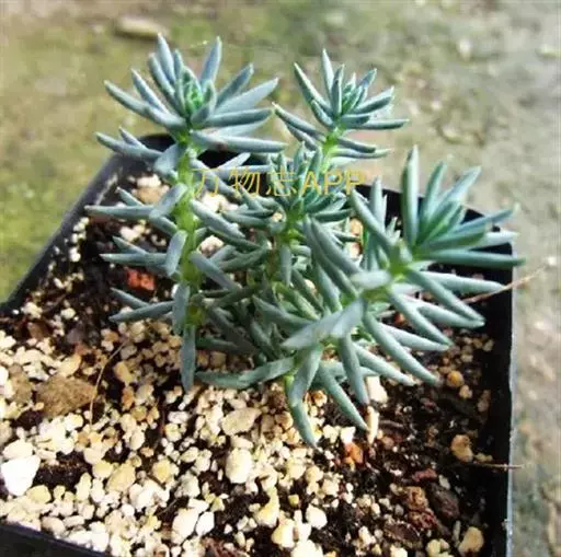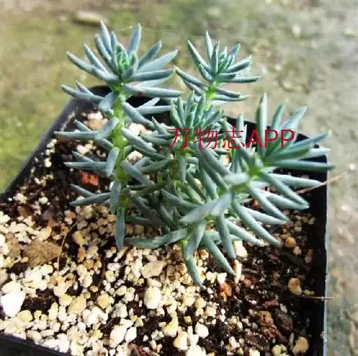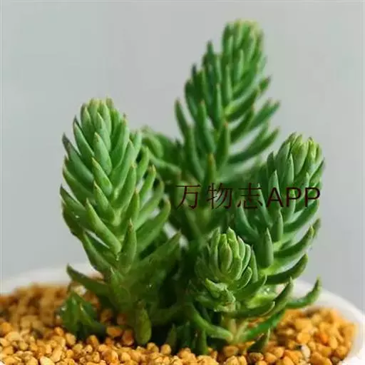多年生草本植物株,叶尖尖的,型似“棒子”,生有气根,叶带有白色蜡粉,是灰蓝的,有种朦胧之美,叶在小枝上的排列似云杉,分叉多。像球松(小松绿)一样是直立的小型多肉植物,但没有球松健壮,两者同属同科。非常适合做庭院的地被。多年生草本,常年蓝绿色,非常的好养,植株叶片交互环生,容易长小侧芽,能够长成大串的一群,时间长了有枝干,枝干无法支撑强大的枝条基本会匍匐生长,簇状花序,花开黄色,异花授粉。