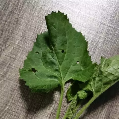 基部叶及莲座状叶匙形或长圆状匙形,长2-7厘米,宽0.5-2厘米,下部渐狭成短或长柄,顶端圆形或尖,边缘无齿或稀有少数浅齿,茎部叶3-5个,长圆形或长圆披针形,长3-7厘米,宽0.3-2厘米,基部渐狭或急狭,常半抱茎,上部叶小,线形;全部叶质薄,两面被密长毛或近无毛,或有腺;离基三出脉和侧脉细。
