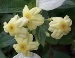 栀子花,花朵簇状约30枚瓣,奶油色,中心黄色;花径12cm;气味果香.