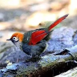 赤尾噪鹛中型鸟类,体长24~28厘米。头顶至后颈红棕色,两翅和尾鲜红色,眼先、眉纹、颊、颏和喉黑色,…
