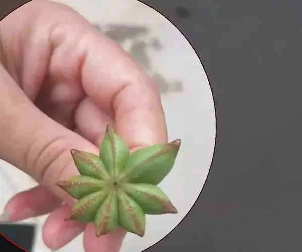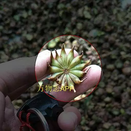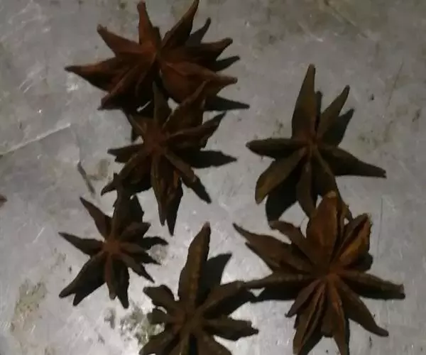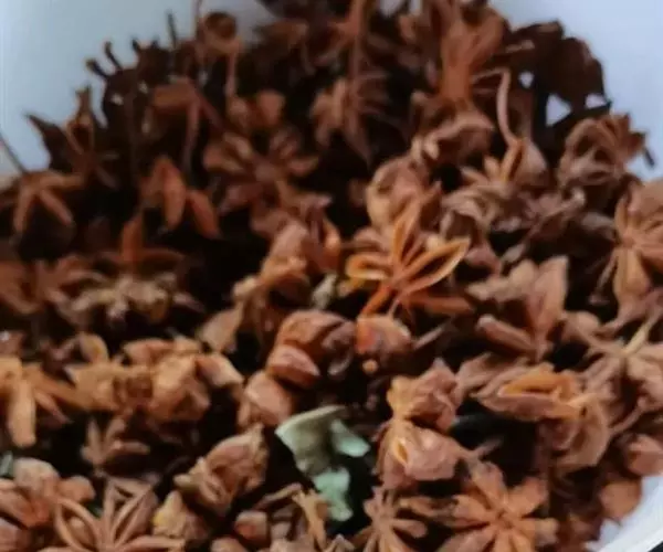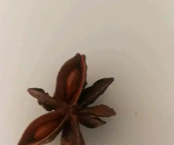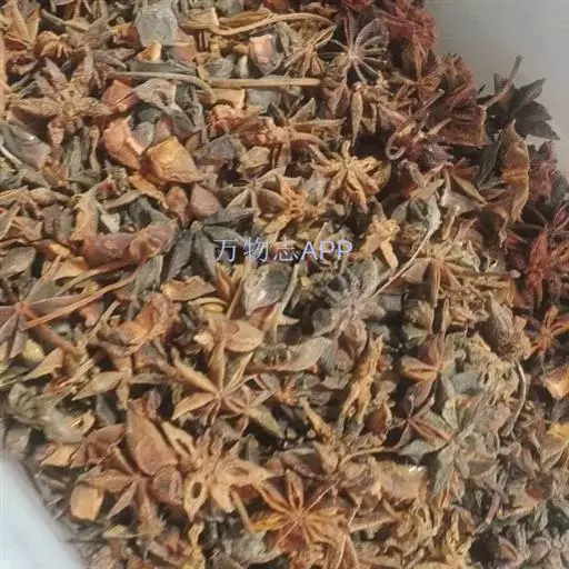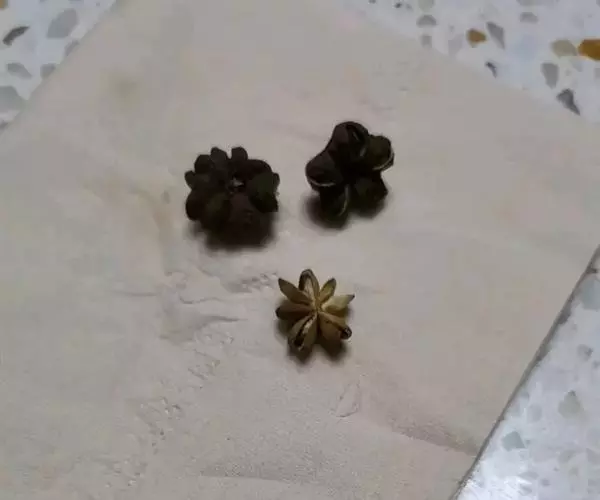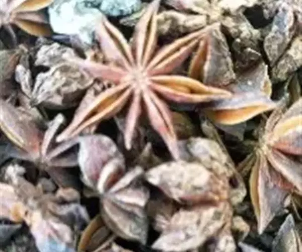 短柱八角:由10-13个果组成,单一果呈小艇形,长1.8-2.3厘米,宽1.5-1.8厘米,先端急尖,顶端不弯曲,果皮略厚,臭微,味微苦,辣,麻舌。