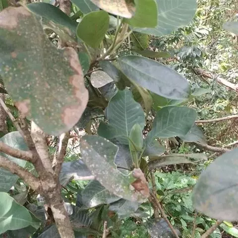 该病大树和苗木均会发生,其在八角的不同部位,常呈现不同症状。叶片发病多在叶缘、叶尖和叶片中部。初期出现暗褐色水渍状小斑,逐渐扩大成不规则的黄褐色大斑,后期病斑中部变为灰褐色,其上密布小黑点的病班;病班中央穿孔,叶片渐渐枯萎脱落。湿度较大时,病症为桔红色粘状小颗粒。幼苗茎基部发病时呈水渍状褐色小班,后扩大成黑腐斑,并使苗木迅速枯死。