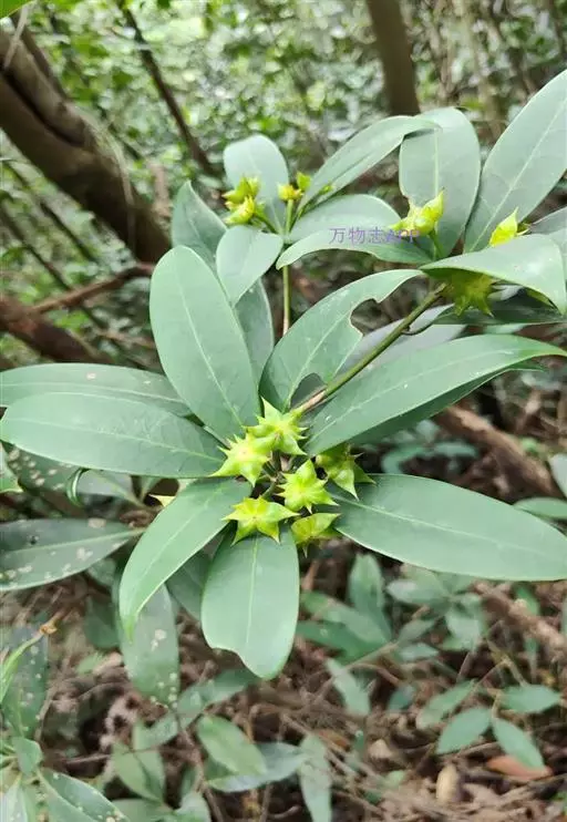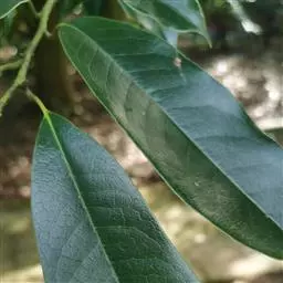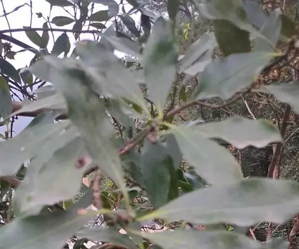 叶不整齐互生,在顶端3-6片近轮生或松散簇生,革质,厚革质,倒卵状椭圆形,倒披针形或椭圆形,长5-15厘米,宽2-5厘米,先端骤尖或短渐尖,基部渐狭或楔形;在阳光下可见密布透明油点;中脉在叶上面稍凹下,在下面隆起;叶柄长8-20毫米。