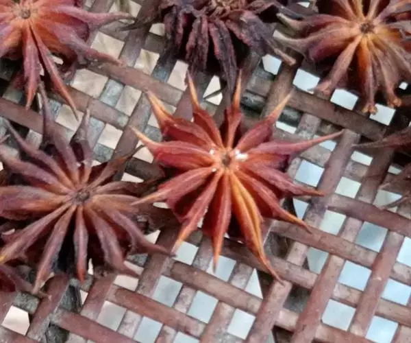 大八角:骨突果10-14枚组成聚合果。呈灰棕色或灰褐色。果实皮薄,单瓣果实的前端长而渐尖,略弯曲。气味弱而特殊,滋味淡,有麻舌感。