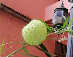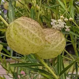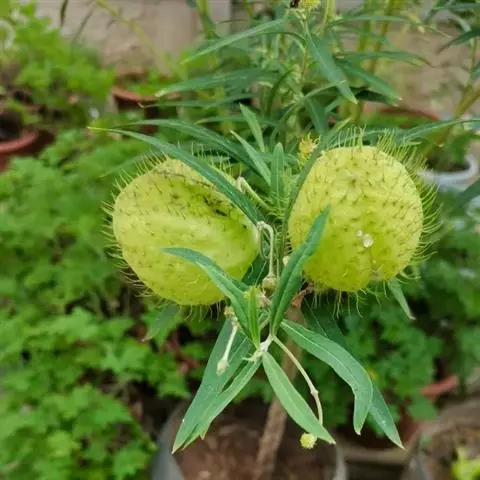 萝藦的果实黄绿色,果梗处浑圆,果身椭圆,头部尖尖,呈流线型,极似一个拉长了的棉桃,外皮可见疣状斑点,如星散落,形状可爱好玩。用它的果实,可以玩拾子游戏,可以在地头下五子棋。不过,掐它的果实的时候,注意别让它的白汁染在衣服上,不然会很难洗掉。民间有些别称,就是依据它的果实形状而起的。《救荒本草》中称它为:“婆婆针线扎儿”;《袖珍方》中称它为:“婆婆针线袋儿”;《本草纲目》中称它为:“婆婆针线包儿”。或许,古代先民就是依据萝藦的果实形状,来仿制针线包的吧?萝藦果实老熟后,会从中间纵裂开,褐色扁平卵状种子,附着在狭翅上,借助风力,它们的白绒便象蒲公英种子那样飞往四面八方,所到之处静候时机成熟,便会有新的萝藦幼苗萌生。种子飞走后,果壳呈瓢状,所以有些地方称萝藦为:哈利瓢、老鸹瓢、墙瓢、雀瓢。先民将葫芦的硬壳一分为二,称之为瓢,用来舀水、喝水,吃饭、饮酒,是为家私和劳作的工具。