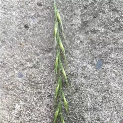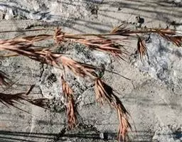 穗形总状花序单生于秆顶,长1.5-3厘米(芒除外),宽约1毫米,细弱而微弯曲,乳黄色;总状花序轴节间与小穗柄均压扁,长为无柄小穗的1/3-2/3,两侧具长短不一的纤毛;无柄小穗长不及2毫米,含1两性花,基盘的毛长约与小穗等长或稍长;第一颖背腹扁平,长约1.5毫米,先端截平,具流苏状纤毛,具不明显或明显的2脉,背面稍粗糙;第二颖与小穗等长,稍长于第一颖,舟形,具1脉而呈脊,沿脊粗糙,先端2裂,裂缘有纤毛,脉延伸成弯曲的芒,芒金黄色,长15-18毫米,粗糙;第一小花完全退化或仅存一外稃;第二小花外稃稍短于第一颖,先端2裂,裂片为稃体长的1/3,裂齿间伸出细弱而弯曲的芒,芒长18-24毫米,稍糙;内稃宽卵形,短于外稃,具2脉;雄蕊1枚,花药细小,长约1毫米;花柱自基部分离为2枚;柱头帚刷状,长约1毫米。颖果卵状长圆形,长约0.8毫米。有柄小穗与无柄小穗同形同性,但较小。花果期5-9月。