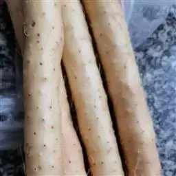 表面黄白色或淡黄色,有纵沟、纵皱纹及须根痕,偶有浅棕色外皮残留。体重、质坚实,不易折断,断面白色粉性,有细小点状突起。气微、味淡、微酸,嚼之发黏。