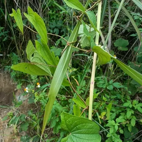 缠绕藤本;块茎圆柱形,垂直生长,直径3厘米左右,表面棕黄色,断面白色。茎细长,光滑无毛。单叶互生,叶腋间常生有不等大小各种形状的珠芽;中部以上叶对生,叶片长椭圆状狭三角形,顶端锐尖,基部心形,长5—10厘米,宽2—5厘米,两面无毛。
