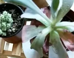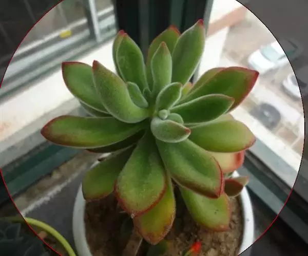肉质叶呈标准的莲座状排列,叶短匙形,稍直立,先端圆而有小尖,微向内弯曲,使全株略呈漏斗形,叶色浅绿或蓝绿,质稍薄,被有白粉或蜡质层。