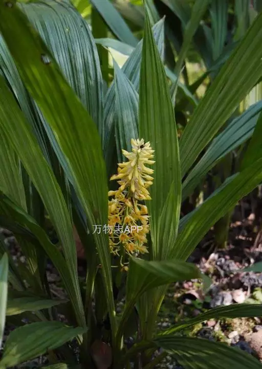 花葶粗壮,侧生,从茎的基部发出,长40厘米或更长,粗5-15厘米,从基部向上具数枚筒状鞘,最下面的1枚最小,长约1厘米,上面的1枚最长;总状花序在花蕾时为苞片所包而呈圆球状,随着花的开放,花序轴逐渐伸长而呈圆柱形;花苞片膜质,狭披针形,长达3.5厘米,在花开放时脱落;花鲜黄色;萼片近相似,卵状披针形,长9-12毫米,中部宽4-5毫米,先端渐尖,具5条脉。