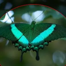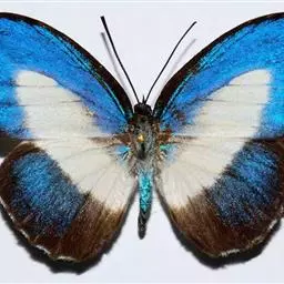 天堂凤蝶(学名:papilio ulysses)翅展可达105mm。前、后翅自基角至(前)后缘约1/2~2/3端为纯净的宝蓝色,(顶)后角至(前)后缘1/3~1/2端为黑色,后翅有黑色的尾突。翅背面为棕褐色。