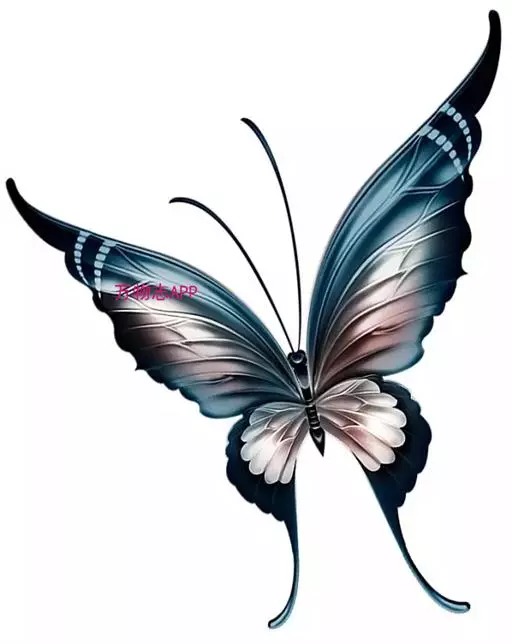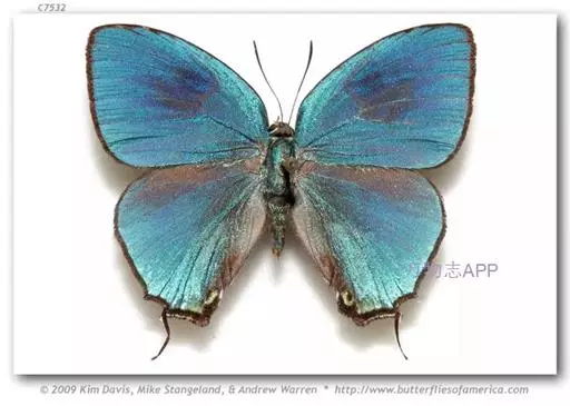 后翅主色调为蓝色,底色黑色。具尾突。外缘呈波浪状。后翅背面深棕色,前缘和外缘处有一连串大棕斑。