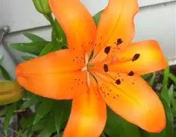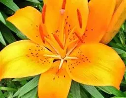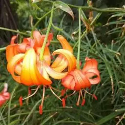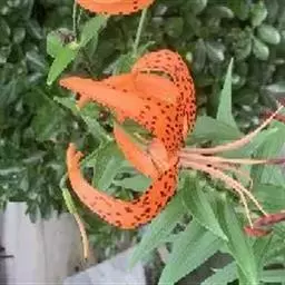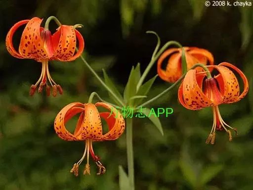 卷丹百合(学名Lilium lancifolium) 又名卷丹、天盖百合、倒垂莲、虎皮百合、珍珠花、黄百合。因花色橙红,花瓣反卷,故名“卷丹”,又因花瓣上有紫黑色斑纹,很象虎背之花纹,故有虎皮百合之雅称。原产中国、日本、朝鲜等地,现各地多有种植。株高70~100厘米,间有高达1.5米的,可称百合之冠。球茎肥大,色白,可供食用和药用,稍带苦味。茎秆上着生黑紫色斑点,使株秆呈暗褐色。叶互生,狭披针形,无柄,密集于茎秆的中上部。叶腋间生有可繁植的珠芽。花夏季开放,数量较多,常3~10朵不等,花色橙红色或砖黄色,花序总状,花瓣较长,约9~12厘米,向外翻卷,花瓣上有紫黑色斑点。花头下垂,雄蕊向四面张开,花药紫色。植株生长健壮,叶腋生珠芽,可以利用珠芽进行繁殖,三倍体卷丹用许多亚洲百合种授粉,都有种间亲和性,能得到种间杂种。