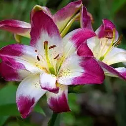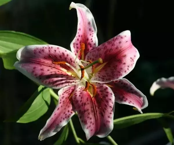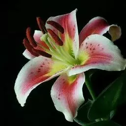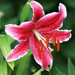 美丽百合(学名Lilium speciosum) 又名鹿子百合、艳红百合。 鹿子百合 鹿子百合原产中国江西省、浙江省、台湾,及日本九州、四国西南滨海地区,株高60~100厘米。叶对生,宽而疏,故名大叶百合。茎上部开花数朵,花瓣向外反卷,雄蕊露出花瓣之外,花白色和淡红色,花瓣上布有玫瑰色花纹和斑点,状如鹿身上的斑纹,故有鹿子百合之美名。花色白者,称白鹿子百合,花色红赤或紫者,叫赤鹿子百合。中国台湾的珍稀品种艳红鹿子百合(Lilium.speciousmThunb.var.gloriosoides Baker.),被称为“东亚最美丽的百合花”。