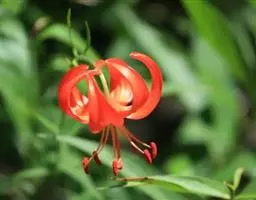 山丹百合(学名Lilium pumilum) 又名山丹花、山丹丹、珊瑚百合、线叶百合、细叶百合。因叶细而多,花冠似珊瑚得名。株秆高30~40厘米,茎上生叶50~80厘米,细小纤弱,狭长如松叶。花春末夏初开放,花下垂,花瓣向外反卷,色鲜红,有光泽。鳞茎卵形或圆锥形,鳞片矩圆形或长卵形。地上茎高达60~80厘米;有小乳头状突起,有的带紫色条纹。叶散生,多数集中在茎的中部,条形,长可达10厘米,中脉下面突出,边缘有乳头状突起。花朵排列成总状花序,有香味;花被鲜红色,通常无斑点,强烈反卷;蜜腺两边有乳头状突起;花丝长约2.5厘米,红色;子房长约1厘米,花柱约长于子房1倍;柱头膨大,3裂。蒴果矩圆形。花期7~8月份,果熟期9~10月份。
