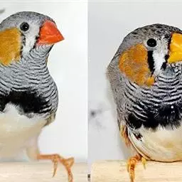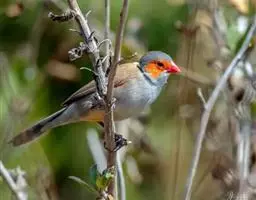 橙颊梅花雀体长约10厘米,头部灰色,两侧有大块橙色区域,嘴基及眼下方有黑纹,两条黑纹间呈白色,…