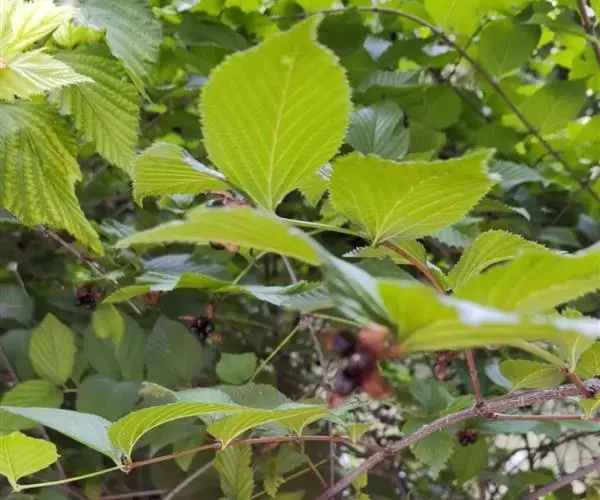 落叶灌木,高0.5-2米,稀达3米。小枝紫褐色,嫩枝绿色,光滑。叶对生,卵形,长 4-11厘米,宽3-6厘米,顶端渐尖,基部圆形至微心形,边缘有尖锐重锯齿,上面幼时被疏柔毛,以后脱落无毛,下面被绢状柔毛,老时脱落仅沿脉被稀疏柔毛;叶柄长2-5毫米,被疏柔毛;托叶膜质狭带形,被疏柔毛,不久脱落。
