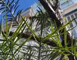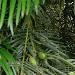 香榧为常绿乔木,嫁接树,高达20米,干基高30-60厘 香榧 米,径达1米,其上有3-4个斜上伸展的树干;小枝下垂,一、二年生小枝绿色,三年生枝呈绿紫色或紫色;叶深绿色,质较软;种子连肉质假种皮宽矩圆形或倒卵圆形,长3-4厘米,径1.5-2.5厘米,有白粉,干后暗紫色,有光泽,顶端具短尖头;种子矩圆状倒卵形或圆柱形,长2.7-3.2厘米,径1-1.6厘米,微有纵浅凹槽,基部尖,胚乳微内皱。