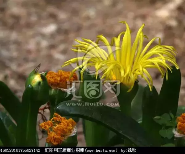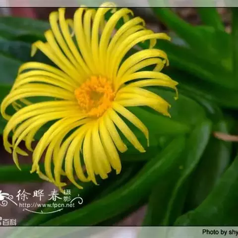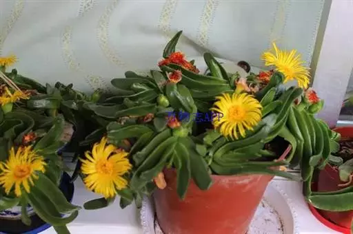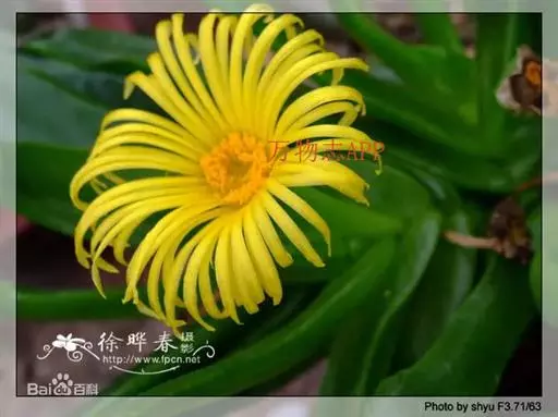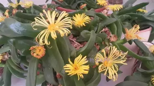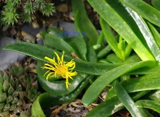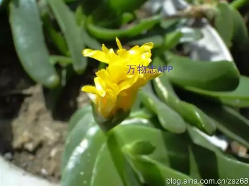 多年生,茎肉质,叉状分枝。叶片舌状或三角状线形,肥厚多肉,鲜绿色,交互对生,紧密排成2列,长约6厘米,宽约1.5厘米,顶端具钝弯钩,基部合生。花顶生,具细长梗,橙黄色,直径约2厘米;花瓣和雄蕊均多数;花托膨大。花期5-6月。