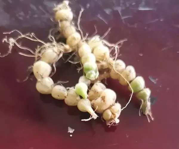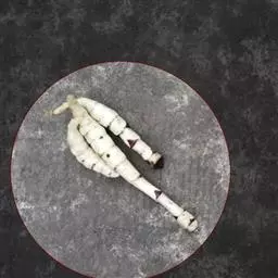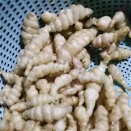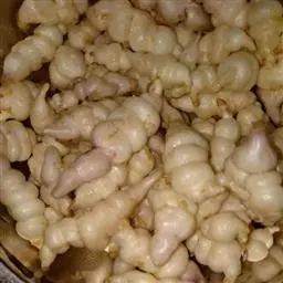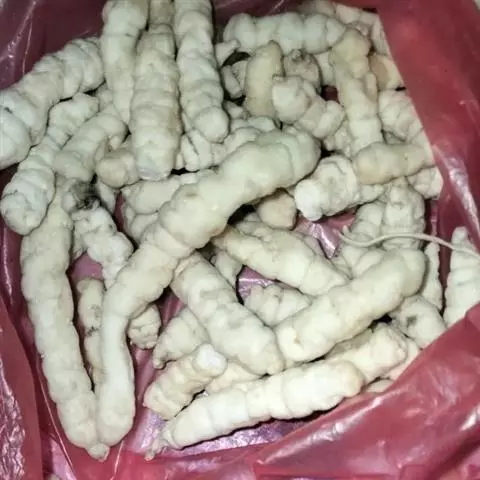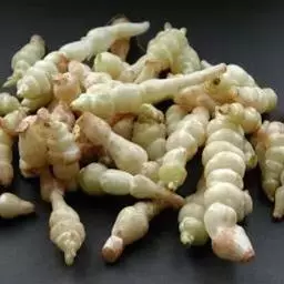 药材性状 根茎多成纺锤形,顶端有的呈螺旋状,两头略尖,长1.5-4cm,直径3-7mm。表面棕黄色,多皱缩,扭曲,具5-15个环节,节间课件点状芽痕及根痕。质坚脆,易折断,断面平坦,白色。气微,味微甘。用水浸泡后易膨胀,节结明显。