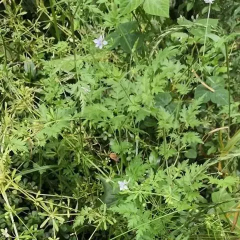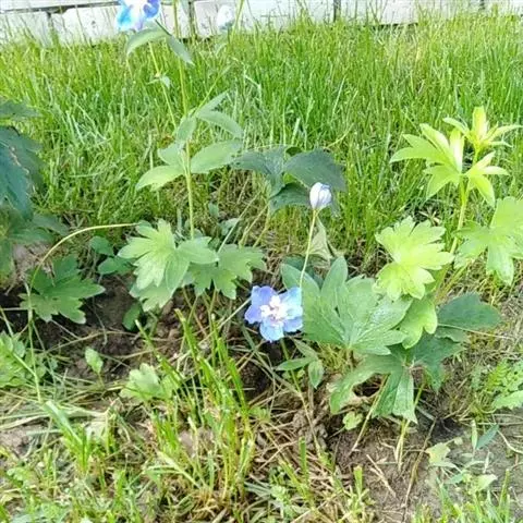 等距地生叶。下部叶在开花时枯萎,茎中部叶有稍长柄;叶片五角状肾形,长约7厘米,宽约10厘米,三深裂至距基部3-5毫米处,中深裂片宽菱形,短渐尖,三深裂,二回裂片有少数狭三角形小裂片,锐尖,侧深裂片扇形,不等二深裂,两面散生少数短柔毛;叶柄与叶片近等长,疏被短柔毛。