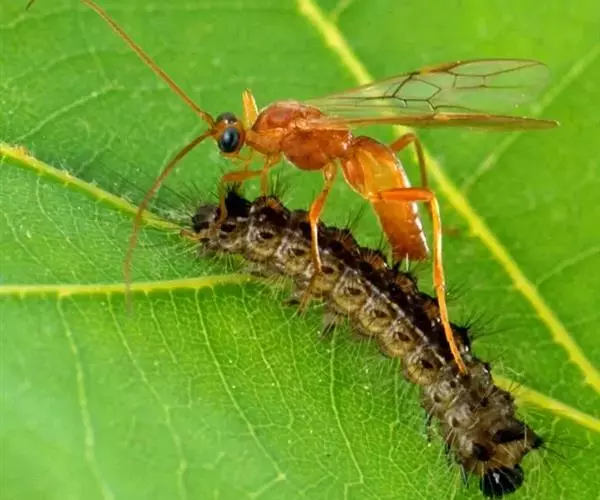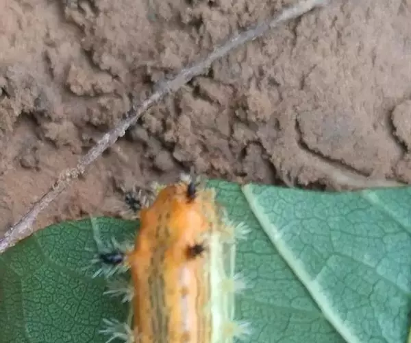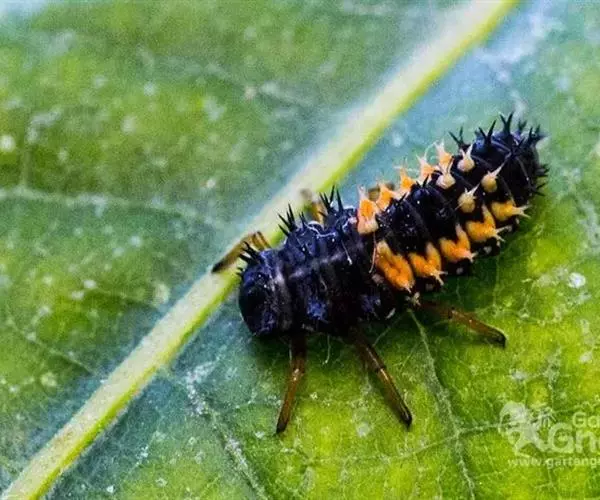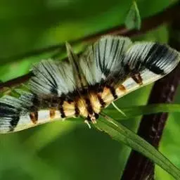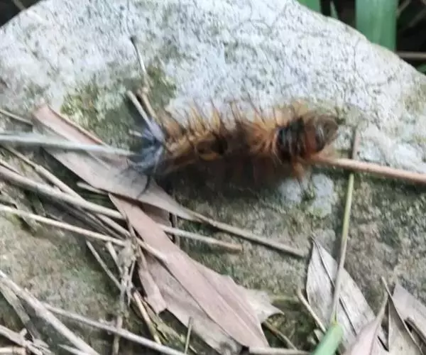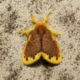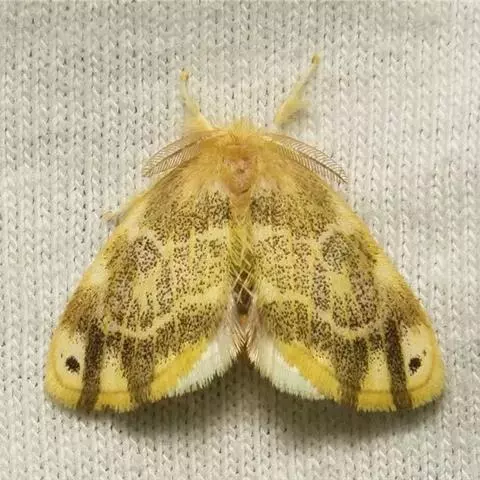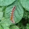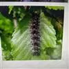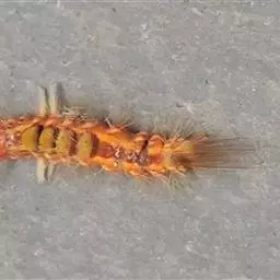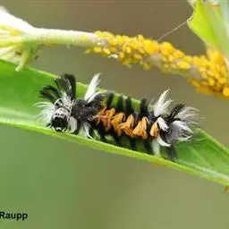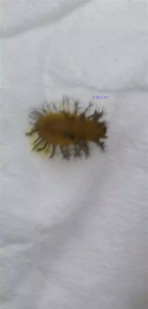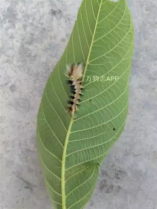 幼虫 体长25~40mm,第1、2腹节宽。头褐黑色,有光泽;体黑褐色,前胸背板黄色,具2条黑色纵线;体背面有一橙黄色带,在第1、2、8腹节中断,带中央贯穿一红褐间断的线;亚背线白色;气门下线红黄色;前胸背面两侧各有一向前突出的红色瘤,瘤上生黑色长毛束和自褐色短毛,其余各节背瘤黑色,生黑褐色长毛和白色羽状毛,第5、6腹节瘤橙红色,生有黑褐色长毛;腹部第1、2节背面各有1对愈合的黑色瘤,上生白色羽状毛和黑褐色长毛;第9腹节瘤橙色,上生黑褐色长毛。