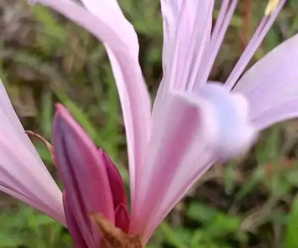 花茎高约60厘米;总苞片2枚,长约3.5厘米,宽约1.2厘米;伞形花序有花4-6朵;花淡紫红色,花被裂片顶端常带蓝色,倒披针形,长约4.5厘米,宽约1厘米,边缘不皱缩;花被筒长1-1.5厘米;雄蕊与花被近等长;花柱略伸出于花被外。花期8-9月。