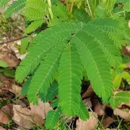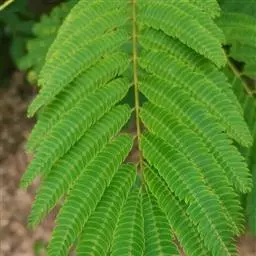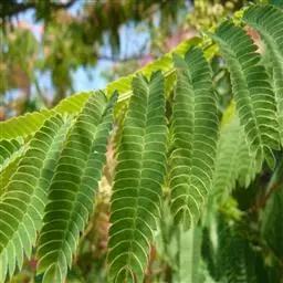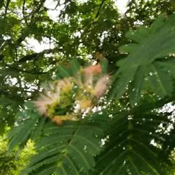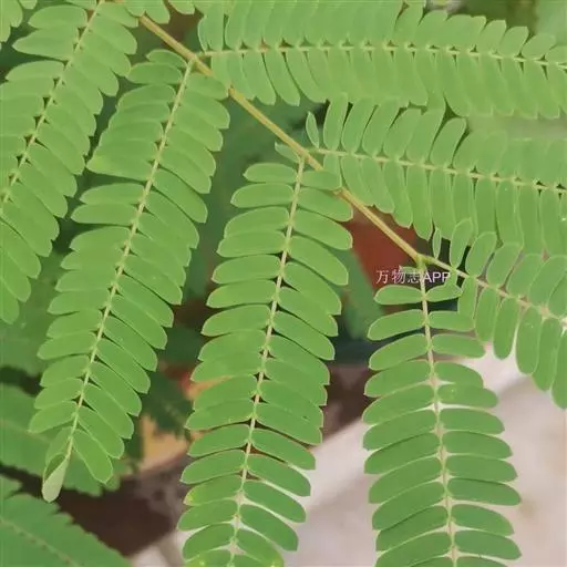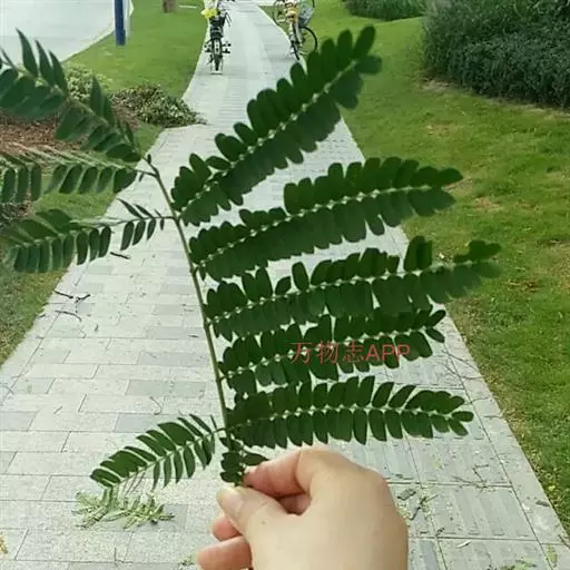 叶:山槐的叶二回羽状复叶,羽片2-4对、小叶5-14对,长圆形或长圆状卵形,长1.8 - 3.5厘米,宽7-17毫米,先端圆钝而有细尖头,基部不等侧,两面均被短柔毛,中脉稍偏于上侧。