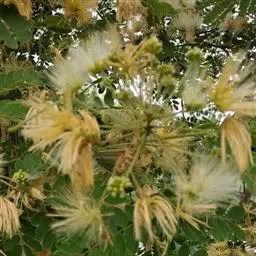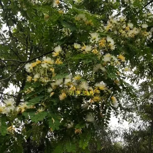 花:山槐的花头状花序2-7枚生于叶腋,或于枝顶排成圆锥花序。花初白色,后变黄,具明显的小花梗;花瞥管状,长2-3毫米,5齿裂。花冠长6-8毫米,中部以下连合呈管状,裂片披针形,花粤、花冠均密被长柔毛;雄蕊长2.5 -3.5厘米,基部连合呈管状。花期6-7月。