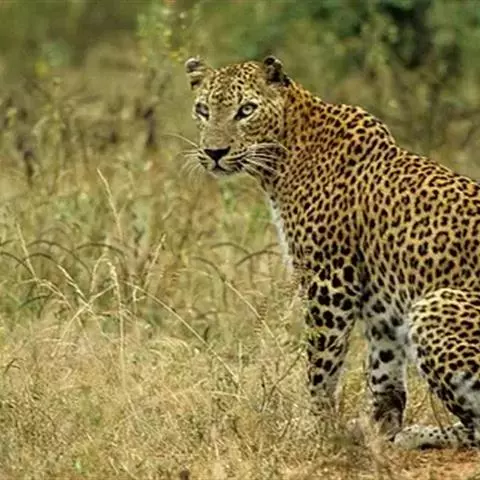 花豹是大型肉食性动物,体形似虎,但明显较小;头小尾长,四肢短健;毛被黄色,满布黑色环斑;头部的斑点…