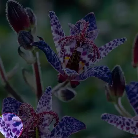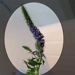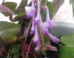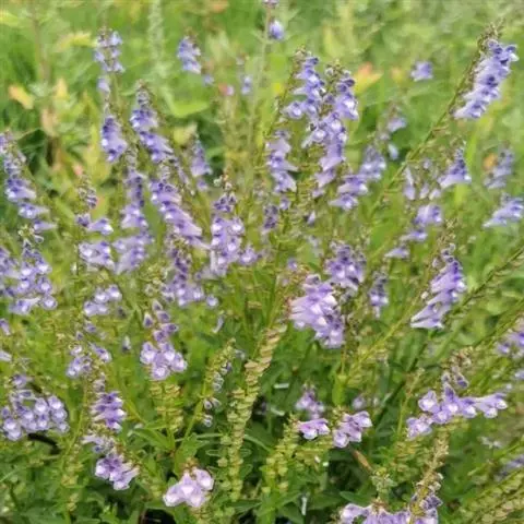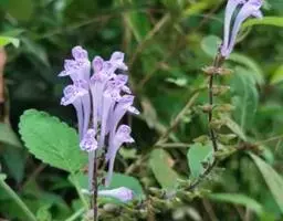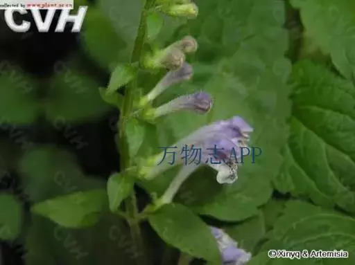 花对生,排列成顶生长4.5-11.5厘米的总状花序;花长约2.5毫米,与序轴密被上曲的白色小柔毛;苞片除花序上最下一对较大且叶状外余均细小,狭披针形,长3-7毫米,宽1-2毫米,全缘,疏被短柔毛。花萼开花时长约3毫米,果时增大,长4毫米,密被小柔毛,盾片开花时高1.5毫米,果时高4毫米。花冠蓝紫色,长1.7-1.8厘米,外被具腺小柔毛,内面无毛;冠筒前方基部略膝曲状,中部宽1.5毫米,向上渐宽,至喉部宽达5毫米;冠檐2唇形,上唇盔状,内凹,顶端微缺,下唇中裂片宽卵圆形,两侧中部微内缢,顶端微缺,两侧裂片卵圆形。雄蕊4,二强;花丝扁平,中部以下被纤毛。花盘肥厚,前方隆起;子房柄短。花柱细长。子房光滑,无毛。