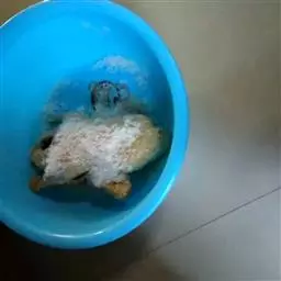 消毒方法:河鲀鱼和毛蚶用0.7mg/L的高锰酸钾水溶液浸泡5~8min。虾苗用20~30mg/L聚维酮碘(含有效碘1%)浸泡10~20min。同时剔除病苗、伤残苗。操作时水温温差控制在3℃以内。