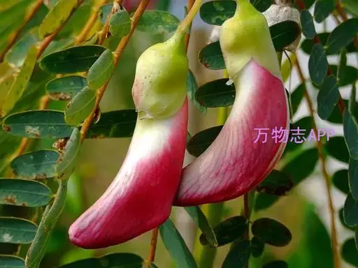 总状花序长4-7厘米,下垂,具2-4花;苞片、小苞片卵形至卵状披针形,长7-10毫米,两面均被柔毛,早落;花大,长7-10厘米,在花蕾时显著呈镰状弯曲;花梗长1-2厘米,密被柔毛;花萼绿色,有时具斑点,钟状,长1.8-2.9厘米,口部直径1.5-2厘米,常2齿,浅二唇形至近截形,除萼齿先端及内缘被毛外,余处无毛;花冠白色、粉红色至玫瑰红色,旗瓣长圆状倒卵形至阔卵形,长5-7.5厘米,宽3.5-5厘米,先端微凹,基部近心形,柄长约1.6厘米,无胼胝体,开花时反折,翼瓣镰状长卵形,不对称,长约5厘米,宽约2厘米,先端钝,柄长约2厘米;龙骨瓣弯曲,长约5厘米,下缘连合成舟状,先端约1/4-1/3分离,钝圆,瓣柄分离,长约2厘米;雄蕊二体,对旗瓣的1枚分离,长约9毫米,花药线形,长4-5毫米,背着;雌蕊线形,长约8厘米,扁平,镰状弯曲,无毛,具子房柄,柱头稍膨大。荚果线形,稍弯曲,下垂,长20-60厘米,宽7-8毫米,厚约8毫米,先端渐狭成喙,长3-4厘米,果颈长约5厘米,熟时缝线处有棱,开裂,种子红褐色,稍有光泽,椭圆形至近肾形,肿胀,稍扁,长约6毫米,宽3-4厘米,种脐圆形,微凹。花果期9月至翌年4月。