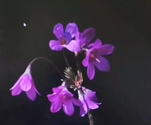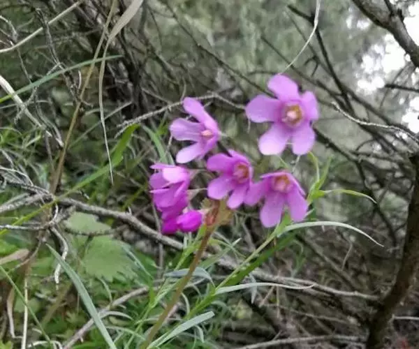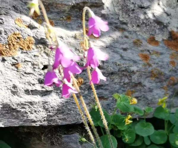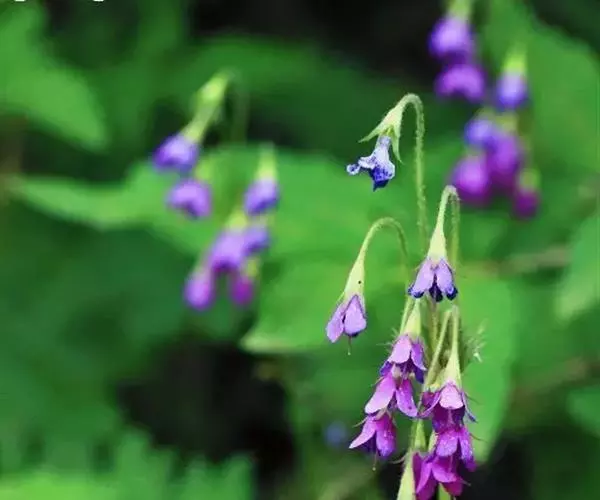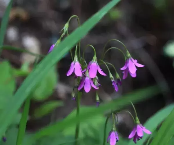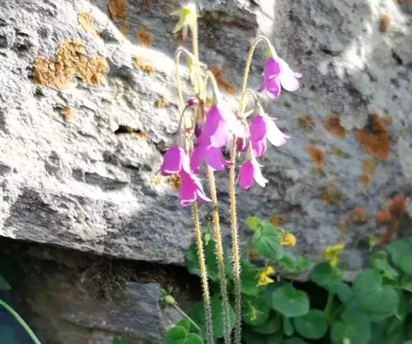 叶柄被纤毛,两侧具膜质翅,长?一13厘米。花葶1—3条,长10— 30厘米,被稀疏纤毛;伞形花序1轮,苞片披针形,被稀疏柔毛;花梗柔弱,开展或下垂,长2—5厘米,参差不齐,花冠漏斗状钟形,紫红色,裂片矩圆形,顶端钝尖,边缘全缘,或有不整齐缺刻,雄蕊生花冠基部。