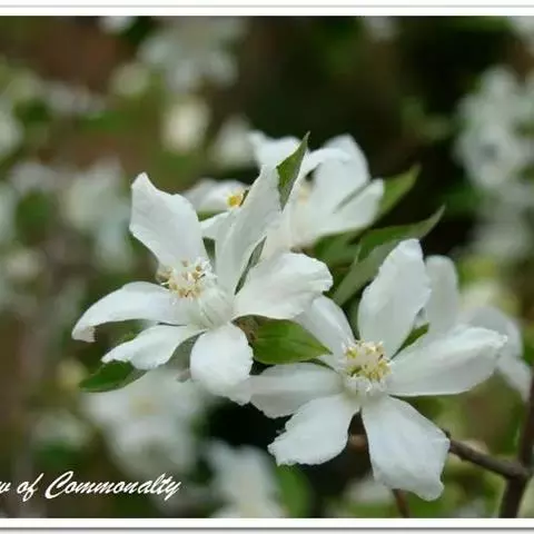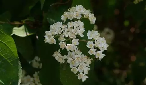 伞房花序直径2-5厘米,多花;花序梗被长柔毛和星状毛;花蕾球形或倒卵形;花冠直径8-15厘米;花梗长2-12毫米;萼筒杯状,高约3.5毫米,直径约3毫米,密被星状毛,裂片三角形,较萼筒短,先端钝;花瓣白色,阔倒卵形或近圆形,长3-7毫米,宽3-5毫米,先端圆,基部急收狭,两面均被毛,花蕾时覆瓦状排列;外轮雄蕊长4-4.5毫米,花丝钻形或近截形,内轮雄蕊长3-4毫米,花丝钻形或具齿,齿长不达花药,花药球形,具柄;花柱3,较雄蕊稍短。