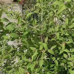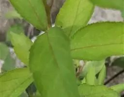 叶纸质,卵形、椭圆状卵形或卵状披针形,长3-6(-10)厘米,宽2-4.5厘米,先端急尖或短渐尖,基部阔楔形或圆形,边缘具细锯齿,上面疏被5(-6)辐线星状毛,下面被大小不等6-12辐线星状毛,有时具中央长辐线或仅中脉两侧有中央长辐线;叶柄长3-8毫米,疏被星状毛。