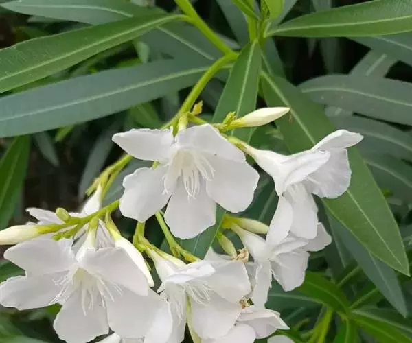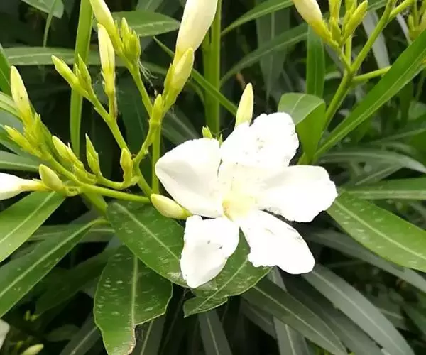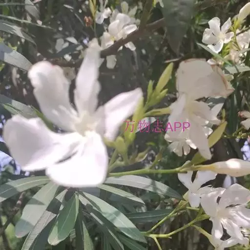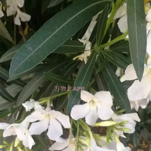 夹竹桃按颜色一般分为红花夹竹桃(Nerium indicum Mill.)、黄花夹竹桃(Thevetia peruviana(Pers.)K.Schum.)和白花 白花夹竹桃,摄于杭州西湖湖畔 夹竹桃三种,其中白花夹竹桃为人工栽培变种,在中国南北各地均有分布,以云南、广东、广西、河北等地多见,