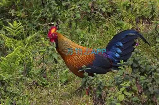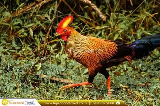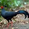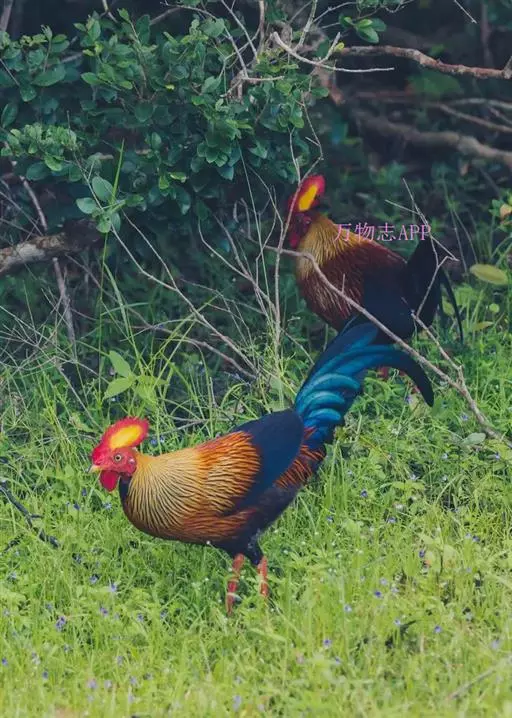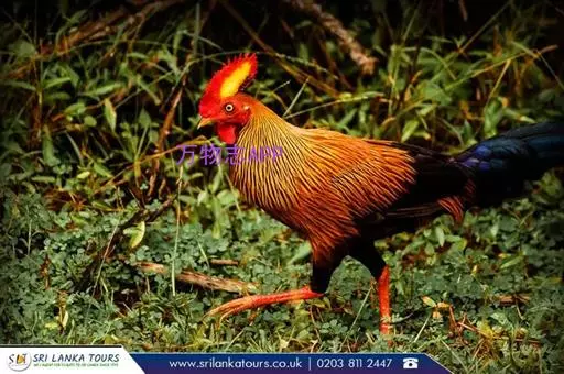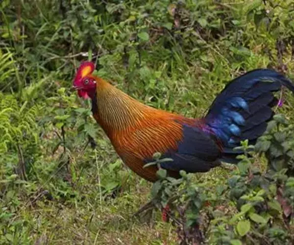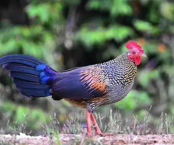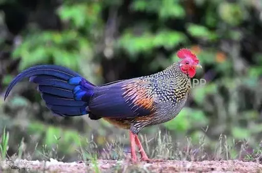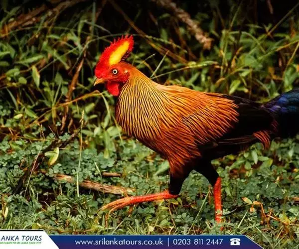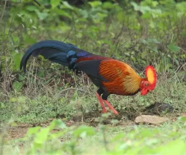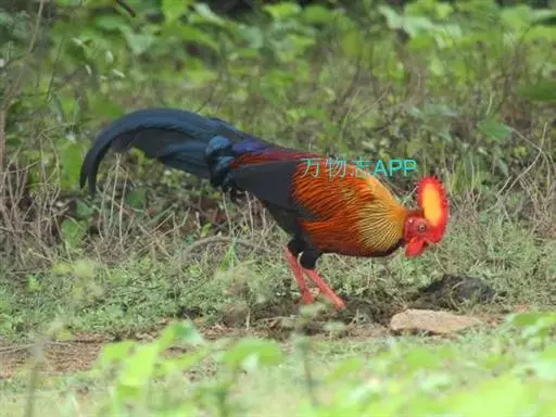 黑尾原鸡(学名:Gallus lafayetii):雄鸟体型较大,体羽艳丽且金属光泽;脸部裸皮、有红色肉冠及肉垂,大而显著;中央两枚尾羽延长,下垂如镰刀状。雌性较小,体色单一,羽毛呈深褐色,下颈部及胸部有一些白斑。
