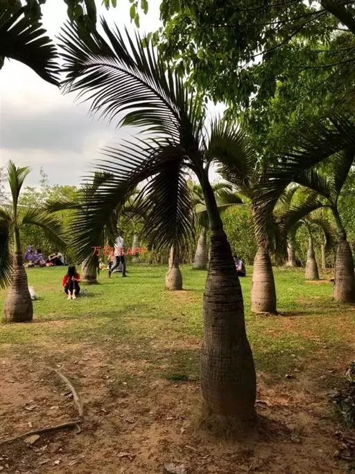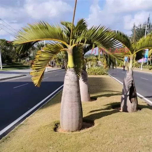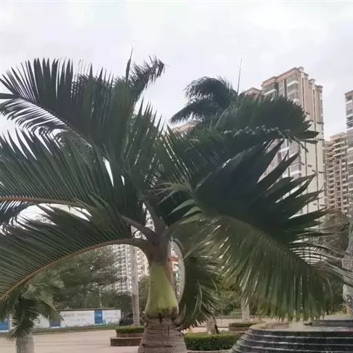 挖苗木时可保留4-7片叶,运输前应把枝叶向上包好,保护好尾梢。用编织袋将士球包严,再用绳子打网状将编织袋缠紧。随掘、随运、随到,随栽植。栽植前,先根据设计定点定位挖种植穴,穴直径比土球直径大1/3左右,深度比土球高度大20厘米左右,在挖好的种植穴基部填入肥沃的细土。栽植时,取出植株包裹土球的包装物,逐层填入肥沃细土,每填入厚度30厘米的细土要用粗棍盅实一次。待差约10-15厘米填满时灌入清水,让填土及土球吸透水分,再将余土填上,直到树干基部稍呈鼓凸状为止。栽植完成后应立即立支柱支撑植株,假槟榔树冠体积相对较小,加之事先已对其进行修剪,因此使用矮三角术架支撑即可。