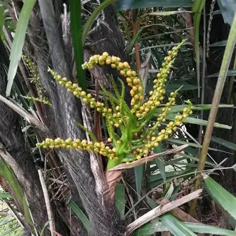 花序生于叶鞘下,呈圆锥花序式,下垂,长30-40厘米,多分枝,花序轴略具棱和弯曲,具2个鞘状佛焰苞,长45厘米;花雌雄同株,白色;雄花萼片3,三角状圆形,长约3毫米;花瓣3,斜卵状长圆形,长约6毫米,雄蕊通常9-10;雌花萼片和花瓣各3片,圆形,长3-4毫米。