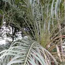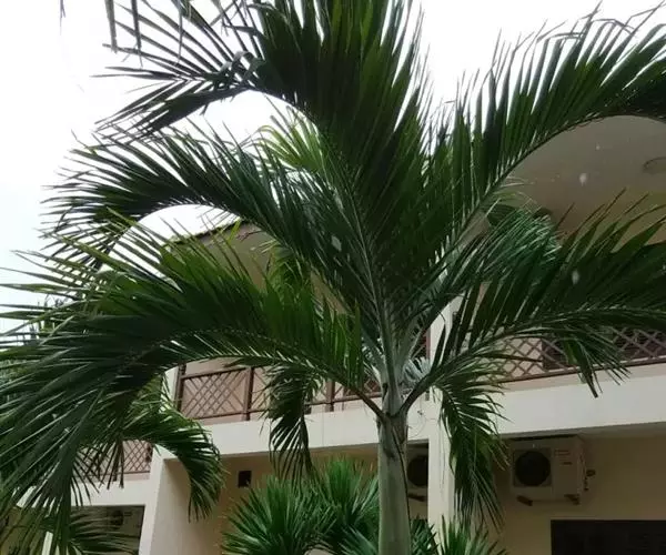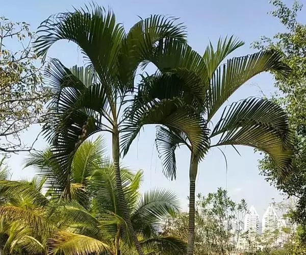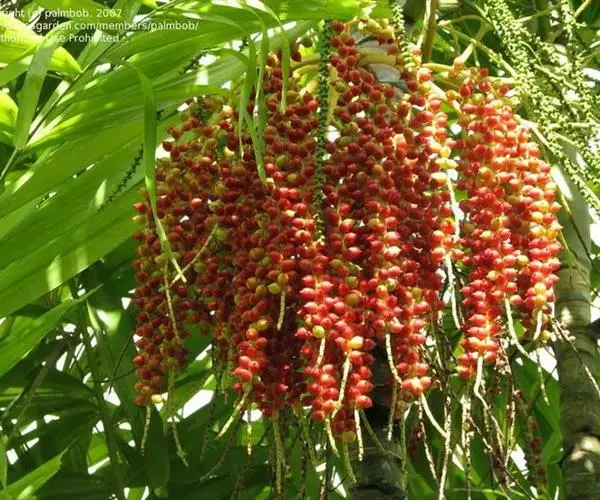 假槟榔 乔木状,高达10-25米,茎粗约15厘米,圆柱状,基部略膨大。叶羽状全裂,生于茎顶,长2-3米,羽片呈2列排列,线状披针形,长达45厘米,宽1.2-2.5厘米,先端渐尖,全缘或有缺刻,叶面绿色,叶背面被灰白色鳞秕状物,中脉明显;叶轴和叶柄厚而宽,无毛或稍被鳞秕;叶鞘绿色,膨大而包茎,形成明显的冠茎。