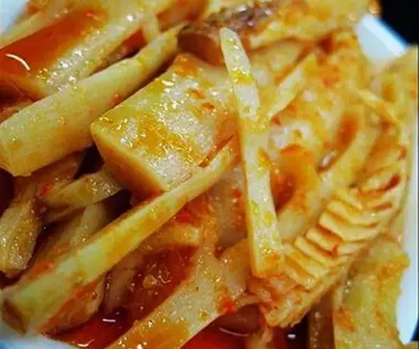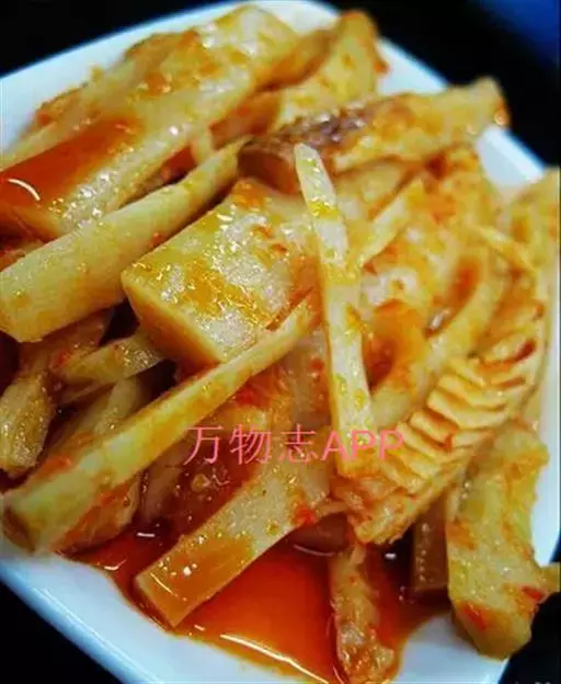湖南是冬笋的主要产区之一,湘西山区人民尤喜食笋。此莱是以冬笋尖为主料制成,白中带红,脆嫩鲜辣,富有浓郁的地方特色。
