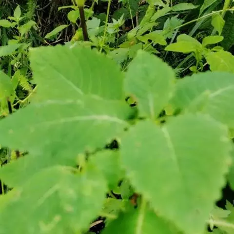 叶互生,菱状卵形或菱状披针形,长5-13厘米,宽2.5-5厘米,先端渐尖,基部楔形,边缘有锐锯齿,侧脉7-9对;叶柄长1-2.5厘米。