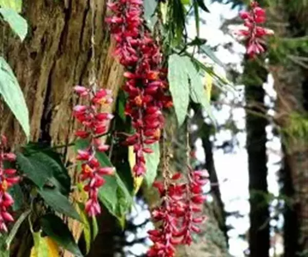 总状花序顶生或腋生,长可达35厘米 (C. W. Wang 78937),下垂,总花梗、花轴、花梗、小苞片被短柔毛;苞片叶状无柄,上面无毛,背面疏被短柔毛,每苞腋着生1~3朵花;花梗长3~4厘米;小苞片长圆形,长2.2~2.6厘米,宽1.1~1.5厘米,先端急尖;花冠红色,花冠管长5~6毫米,先端着生花药处被绒毛,喉长15~16毫米,花冠管和喉间缢缩,冠檐裂片近圆形,长7毫米。花丝长14.5和12.5毫米,无毛,花药不等大,稍外露,具短尖头,长4.5毫米和5.5毫米,每花药2药室不等大,基部具距,长花药的长室长5.5毫米,距长1毫米,短室长4.8毫米,距长2毫米,短花药的长室长4.5毫米,距长2毫米,短室长3.8毫米,距长3毫米;子房和花柱无毛,柱头露出,2裂,裂片相等。
