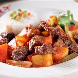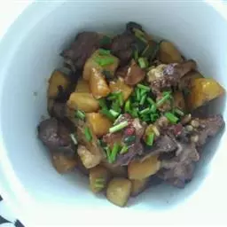 4.北方的“把子肉“却不加糖,长方形的大块,只是酱油八角在高筒瓦罐中炖熟。火候到处,一启封香气四溢。趁热连肉带汁浇在白米饭上,亦十分甘美。